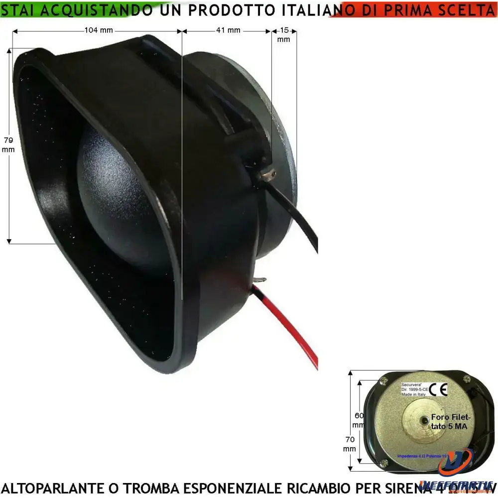 SH-G10 Exponential magnetodynamic horn or loudspeaker. Coil resistance or Impedance 4 Ω ± 15%. Power 15 W. Resonance frequency 1.3 ± 20 KHz. SPL @ 1W/1m: 103dB. Operating temperature - 20° + 60° C. Permanent magnet Ø 69 mm; thickness 15 mm. Rounded circumrectangular shape. Horn or acoustic diffuser in ABS. Shape External dimensions L104XH79XP55 mm. Weight 458 gr. Equipped with 2 wires of approximately 200 mm. for the connection. Be careful, never apply direct current as it would burn immediately, the speaker is used on special amplifier circuits, whether it is used as a sound speaker for sirens or as a sound reproducer. The product is tested, new and in perfect working order, it is not guaranteed against improper use. The buyer knows that he is purchasing a component of a system and declares that he possesses the technical requirements necessary for use. In particular, it is the replacement speaker for the Standard Alarm sirens. Original product built to our specifications; Selected and guaranteed by Securvera. Compliance with CEI 79/2-3 safety standards. CEI EN 50130-4 Directives CE marking directive 99/5/CE. Product assembled and selected in the Securvera Roma factory. Guaranteed by law against defects and manufacturing defects.