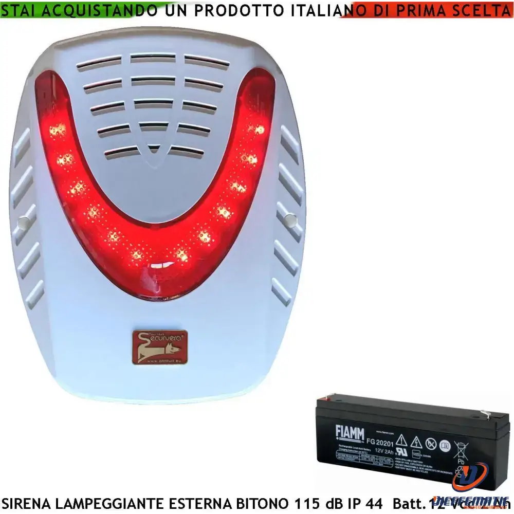 Sirène LED clignotante bicolore avec diffuseur magnétodynamique. Mélodie bitone. Pression sonore 115 dB. Fréquence de A/B 1724 - 2475 Hz. LED d'état droite et gauche pour 2 signaux clignotants actifs. Batterie Fiamm 12 V. 2 Ah chargée et sélectionnée par Securvera. Installation visible pour la visibilité du clignotant. Alimentation 12 Vcc. Absorption : (au repos) 15 mA ; (en alarme) 1,4 Ah. Récipient en plastique ABS. Dimensions H292XL238XP100 mm. Poids 2400 gr. Conforme aux directives européennes : ETSI EN 300 220-1 V2.21 (04-2008), ETSI EN 301 489-3 V1.4.1 (08-2002), EN 60730-1 : 2003 CEE89/336 et 93/686 DL 04 /12/1992 n. 47