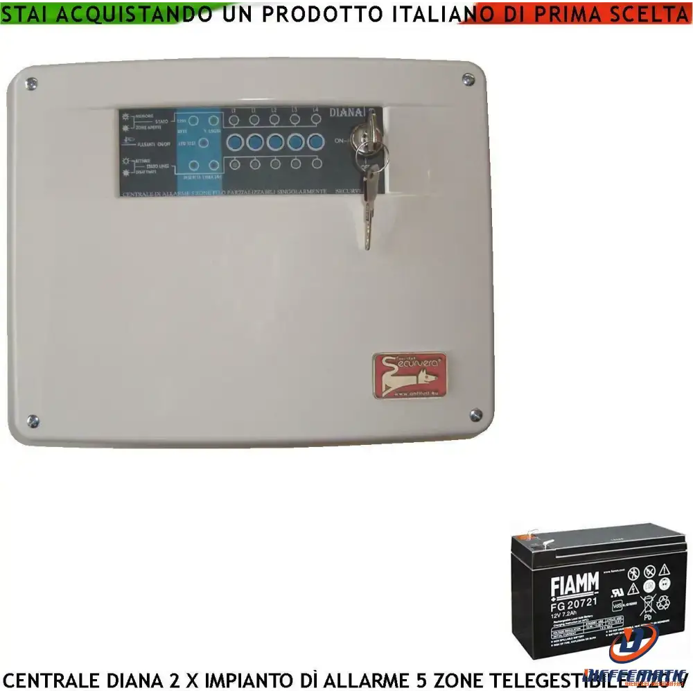 Centrale Diana Antifurto 5 Zone Batteria 12 V 7,2 Ah per Impianto di Allarme Filare Chiave Meccanica Gestisce Sensori di Movimento e di Scasso Ingresso Comando Remoto o Telegestione Uscita di Comando per Sirene e Combinatore GSM - SH-D2FCDB7ZFB