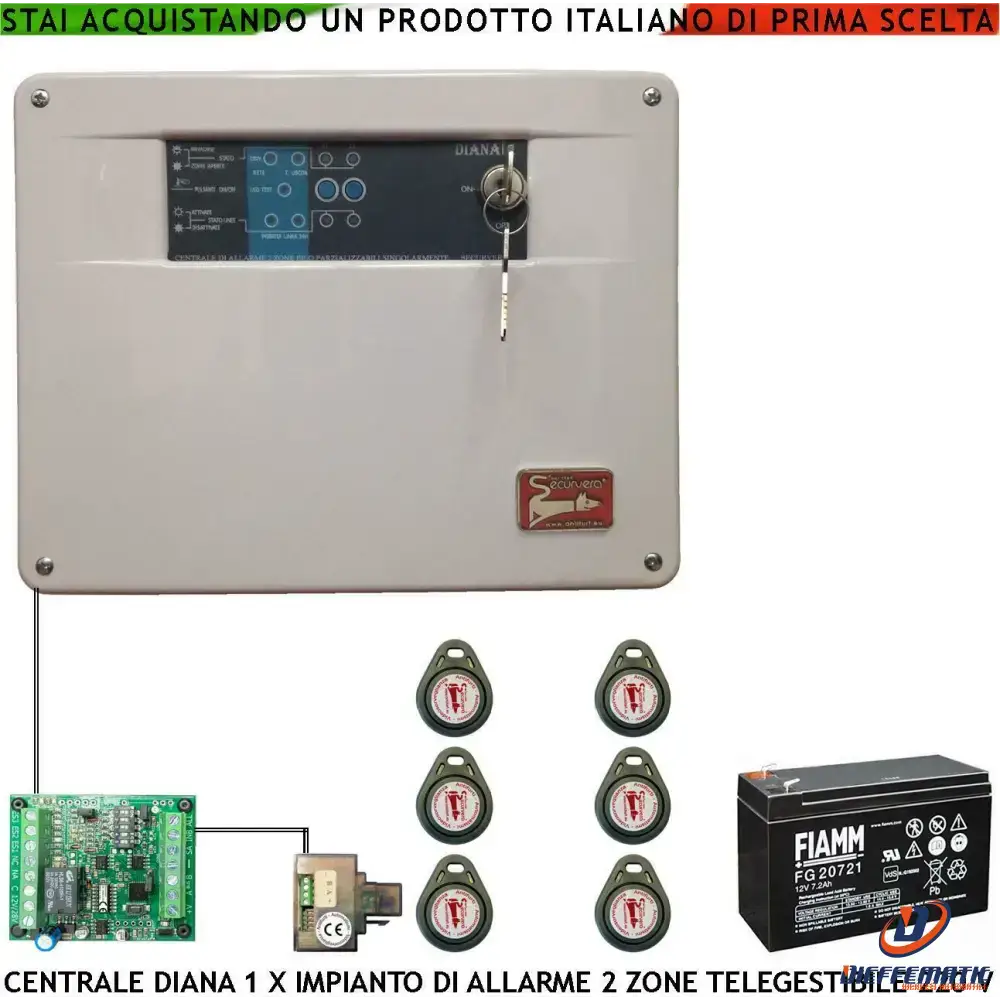 Diana Centrale Allarme 2 Zone Batteria 12 V 7,2 Ah Chiave di Prossimità 6 TAG per Impianto di Allarme Filare Gestisce Sensori di Movimento e Scasso Ingresso per chiave o Telegestione Uscita di Comando per Sirene e Combinatore GSM - SH-D1FCULT6TD