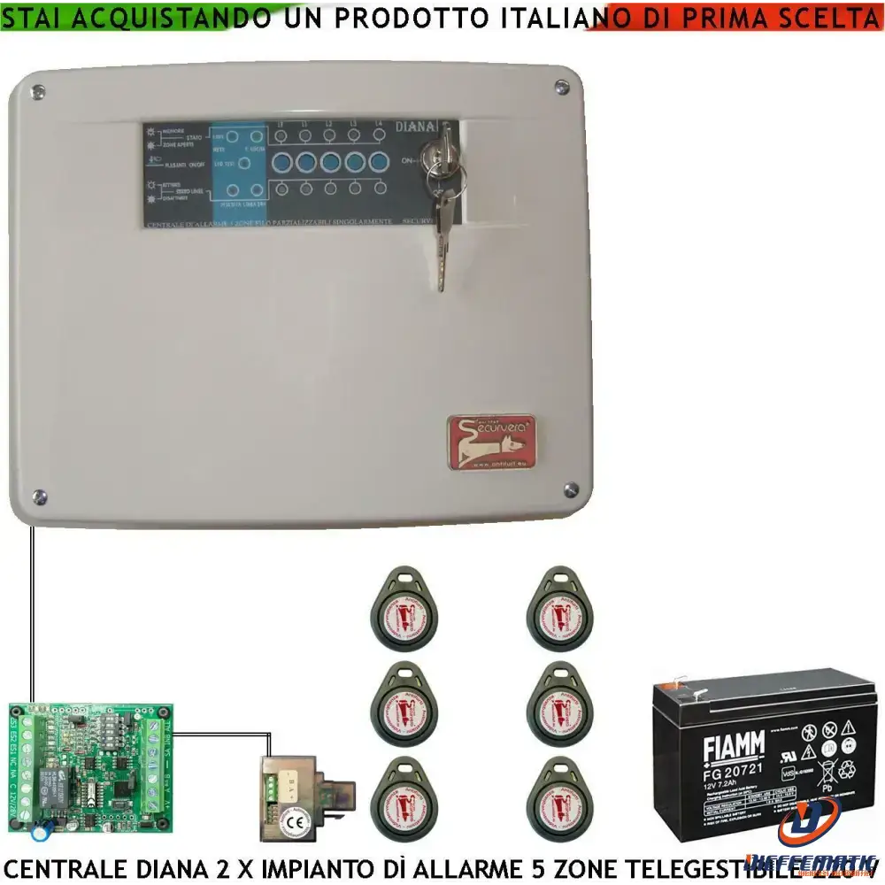 Diana Centrale Allarme 5 Zone Batteria 12 V 7,2 Ah Chiave di Prossimità 6 TAG per Impianto di Allarme Filare Gestisce Sensori di Movimento e Scasso Ingresso per chiave o Telegestione Uscita di Comando per Sirene e Combinatore GSM - SH-D2FCULT6TD