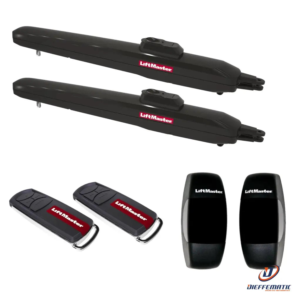 LA300EVK-01 - Kit apricancello intelligente a doppia anta - Kit operatore a vite 24 V CC per cancelli residenziali a battente pesante a doppia anta con max. Peso dell'anta di 300 kg o larghezza dell'anta di 3 metri (larghezza di apertura max. 6 metri con 2 ante). myQ pronto per il controllo tramite smartphone, richiede LiftMaster myQ gateway 828EV. Apertura massima del cancello di 120°. Motori IP44, scheda di controllo IP65. Risparmio energetico grazie al basso standby di 4,2 W. incl. 2 bracci operatore con cavi da 1,5 metri, 2 telecomandi TX4EVF, 1 scheda di controllo con modulo radio myQ integrato prefissato nella e-box insieme al trasformatore, 2 staffe per montante e 2 per anta del cancello, 4 chiavi per sblocco di emergenza . Kit accessori esteso incluso: 1 set di fotocellule 772E-01.
