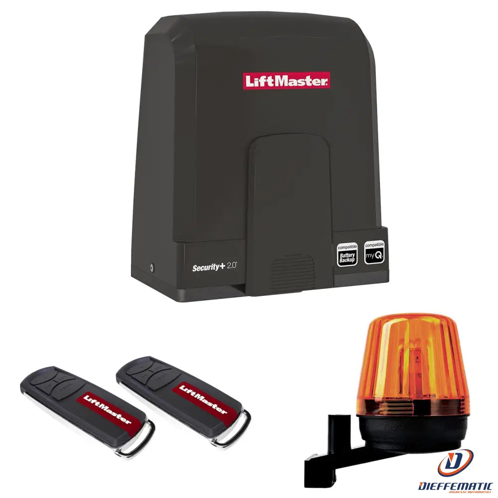 SL400EVK-02 - Kit apricancello scorrevole - Apricancello standard 24V DC per cancelli scorrevoli residenziali standard fino a 5 metri di larghezza e 400 kg di peso. Richiede inoltre una cremagliera in metallo tipo IV 4 metri 202097-01 + 1 metro 320001-01 + viti 320001B-01 o cremagliere in plastica 4 metri 202134-01 + 1 metro 202127-01. La velocità di apertura e chiusura di 160 mm/secondo può essere aumentata a 240 mm/secondo impostando una password di protezione. Applicazione a doppia anta possibile con il secondo apricancello EVK LiftMaster. myQ pronto per il controllo tramite smartphone, richiede il gateway LiftMaster myQ 828EV e il set di fotocellule 772E-01. Grado di protezione IP44. Risparmio energetico grazie al basso standby di 4,4 W. incl. 1 operatore con 1 scheda di controllo con modulo radio myQ integrato preinstallato nel corpo dell'operatore insieme a trasformatore, 2 telecomandi TX4EVF, 2 staffe magnetiche di fine corsa, 2 chiavi per sblocco di emergenza e 1 piastra di terra con viti di ancoraggio. Kit accessori esteso incluso: 1 x lampeggiante FLA1-LED