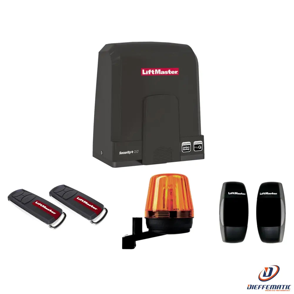 SL600EVK-03 - Kit apricancello scorrevole intelligente - Apricancello 24V DC per cancelli scorrevoli residenziali medio pesanti fino a 8 metri di larghezza e 600 kg di peso. Richiede inoltre una cremagliera dentata in metallo di tipo IV 2 x 4 metri 202097-01 o cremagliere dentate in plastica 2 x 4 metri 202134-01. La velocità di apertura e chiusura di 160 mm/secondo può essere aumentata a 240 mm/secondo impostando una password di protezione. Applicazione a doppia anta possibile con il secondo apricancello EVK LiftMaster. myQ pronto per il controllo tramite smartphone, richiede LiftMaster myQ gateway 828EV. Grado di protezione IP44. Risparmio energetico grazie al basso standby di 4,4 W. incl. 1 operatore con 1 scheda di controllo con modulo radio myQ integrato preinstallato nel corpo dell'operatore insieme a trasformatore, 2 telecomandi TX4EVF, 2 staffe magnetiche di fine corsa, 2 chiavi per sblocco di emergenza e 1 piastra di terra con viti di ancoraggio. Kit accessori estesi inclusi: 1 x set di fotocellule 772E-01, 1 x lampeggiante FLA1-LED