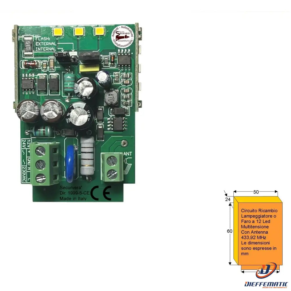 SV-SLU Circuito a 12 Led alta luminosità Ricambio per Lampeggiatore, Intermittenza lampeggio/pause 60 cicli al minuto. Funzione selezionabile luce fissa o lampeggiante. Led disposti a gruppi di 3 a croce per diffondere la luce in tutte le direzioni. Multialimentazione 12 Vcc 24/220 Vac. Assorbimento: led fissi 150 mA. Led lampeggianti 75 mA. Connessione alimentazioni separate tramite morsetti con relative scritte. Contiene antenna accordata 433,92 MHz. Utilizzo ripetitore di allarme remoto; monitore su cancelli automatici; su macchine operatrici. Dimensioni L50XS24XH60+PL35 mm. Peso 60 gr. Prodotto assemblato e selezionato nello stabilimento della Securvera Roma. Garantito a norma di Legge 24 mesi contro difetti e vizi di fabbrica. Risponde alle direttive Europee: EN50131-2-6. CEE 89/336 + 92/31 +93/68 D.L 04/12/1992 N 476. ERP 2009/125/CE; "RoHS" 2015/863/UE; R&TTE 99/05/EC. Compatibilità Elettromagnetica 2014/30/UE; Bassa Tensione 2014/35/UE e successive modifiche, in continuo aggiornamento