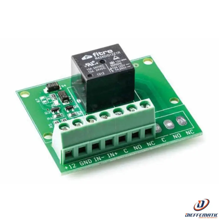 Scheda 12 Vcc a basso assorbimento per open collector con uscita a relè. Un ingresso da 1 mA e un'uscita relè da 3 A. LED di segnalazione.