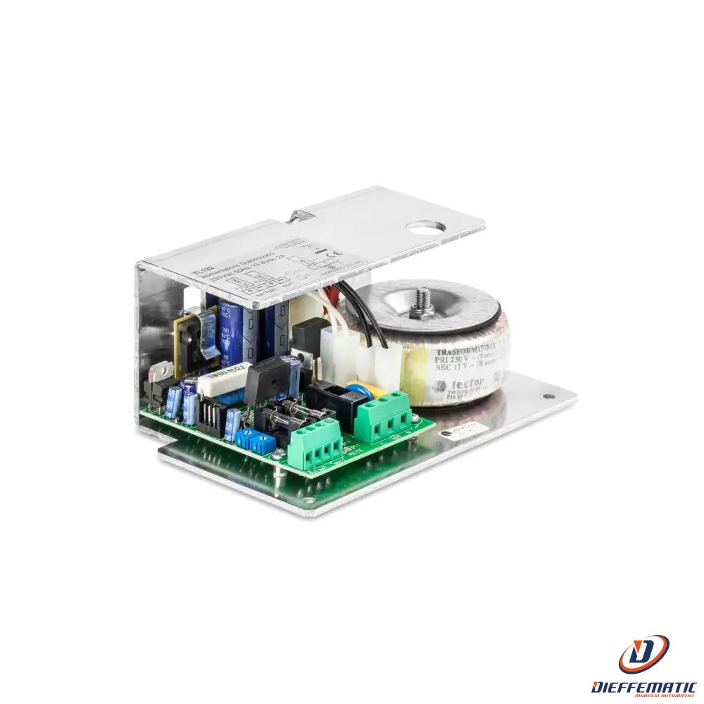 Alimentatore 13,8 Vcc 2 A con 1 uscita per ricarica batteria e 1 uscita indipendente. Regolazione lineare con trasformatore toroidale. LED rosso per l'indicazione sovraccarico.