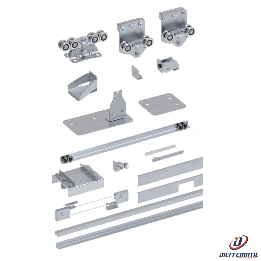 Kit di accessori in acciaio zincato per cancelli autoportanti telescopici. Accessori studiati per garantire le massime prestazioni di funzionalità e durabilità.