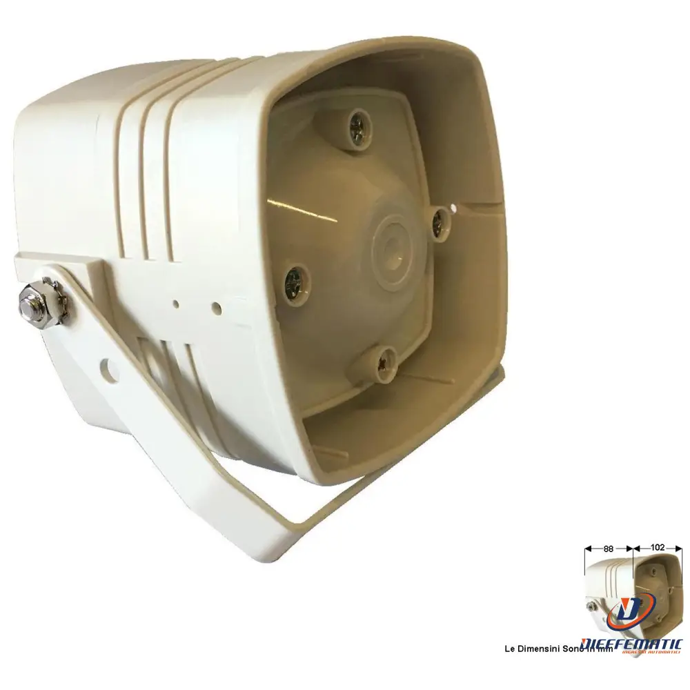 SV-TCV Tromba magnetodinamica esponenziale o Altoparlante. Resistenza bobina o Impedenza 4 ?. Potenza 35 W. 110 dB. Temperatura di funzionamento - 20° + 60° C. Magnete permanente Ø 91 mm; spessore 13 mm. Forma quadrangolare arrotondata. Tromba o diffusore acustico in ABS Fonico. Forma Dimensione esterne L102XH102XP88 mm. Peso 900 gr. Provvisto di 2 fili di circa 100 mm. per la connessione. Attenzione non applicare mai corrente diretta si brucerebbe immediatamente, l'altoparlante si utilizza su appositi circuiti amplificatori, sia che venga utilizzato come Diffusore Sonoro per sirena, che come riproduttore sonoro. Il prodotto è collaudato, nuovo perfettamente funzionante, non è garantito contro l'uso improprio. L'acquirente sa di acquistare un componente di un sistema e si dichiara in possesso dei requisiti tecnici necessari per l'utilizzo. In particolare è l'altoparlante di ricambio della sirene di Allarme Standard. Prodotto assemblato selezionato nello stabilimento della Securvera Roma. Garantito a norma di Legge 24 mesi contro difetti e vizi di fabbrica. Conforme alla direttiva 1999/5/EC (R&TTE).Risponde all'uso ed alle direttive Europee: ETSI EN 300 220-1 V2.21 (04-2008), ETSI EN 301 489-3 V1.4.1 (08-2002), ETSI EN 301 489-1 V1.4.1 (08-2002), EN 60730-1: 2003 CEE89/336 e 93/686 D.L. 04/12/1992 n. 47. Apparecchiature Radio 2014/53/UE. Compatibilità Elettromagnetica 2014/30/UE