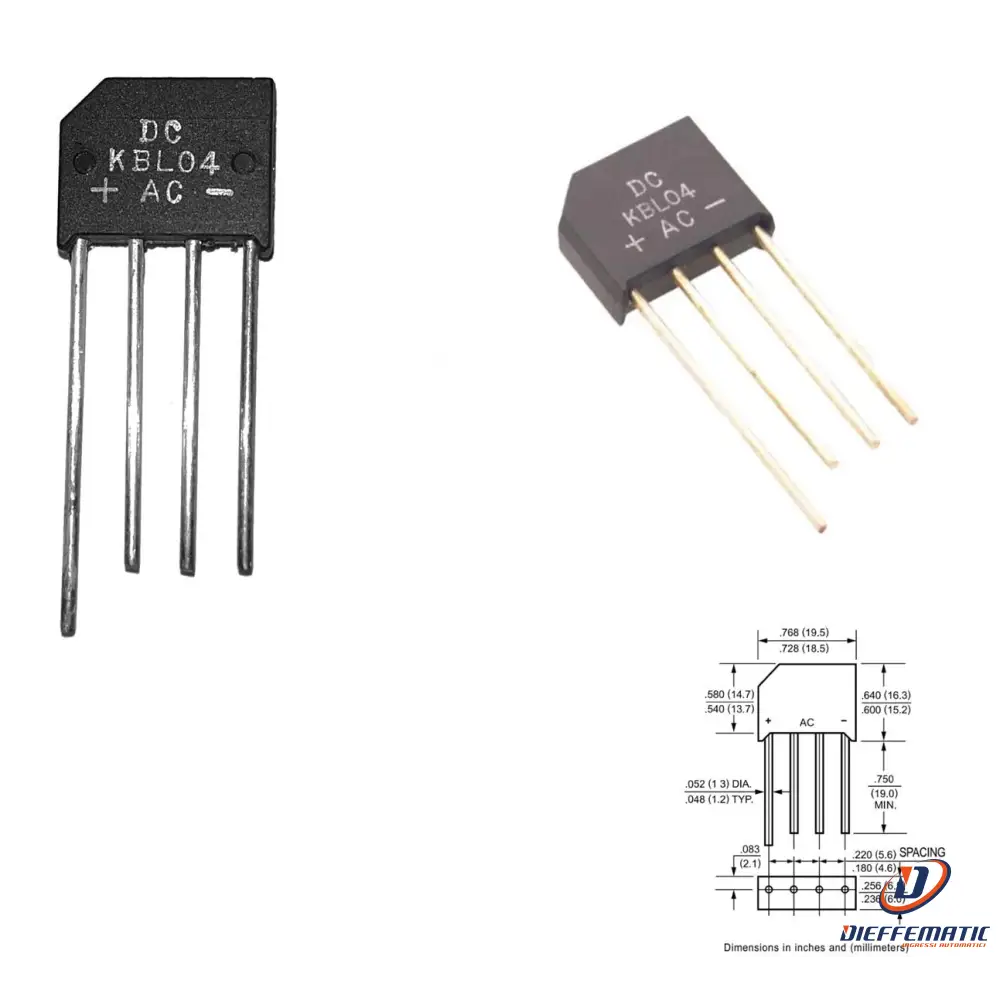Ponte Diodi Raddrizzatore Monofase Serie KBL04 Contenitore Ermetico 4 Reofori Montaggio su Circuito Stampato Tramite Fori Passanti a Saldare Tensione Lavoro 400 Vca 4 Amper Risponde alla Norma ROHS3