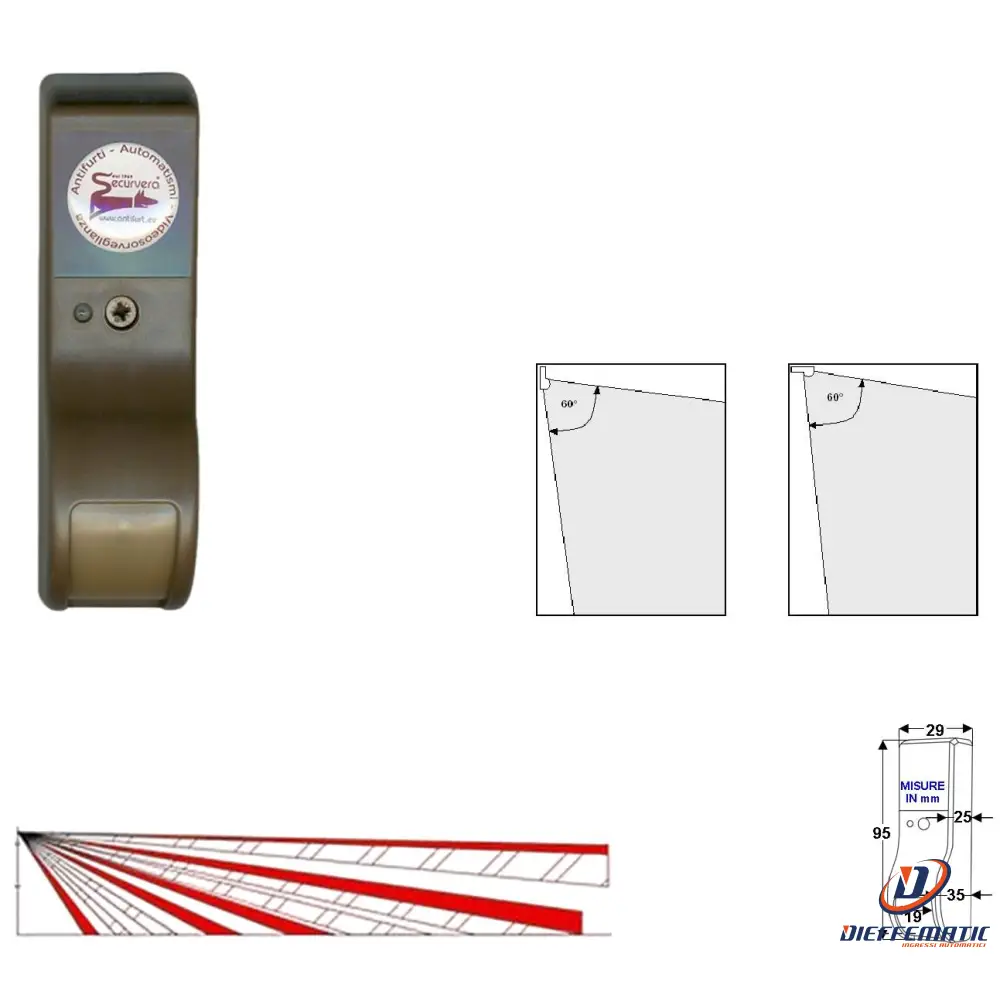 SV-SLM Rilevatore di movimento doppio infrarosso passivo a tenda, Rilevatore duale a bassissimo rumore, portata 8 metri, angolo Verticale 60 gradi, angolo orizzontale 7 gradi, trasmissione in allarme 1". Led segnalazione allarme. La stabilità dell'elaboratore lo rende immune a correnti d'aria adatto per un utilizzo esterno protetto, da evitare però qualsiasi esposizione diretta agli agenti atmosferici pioggia, raggi solari diretti. Evitare le zanzariere in metallo e fibra di carbonio. Ottima protezione antintrusione per balconi coperti, finestre, lucernari, porticati. Il sensore rileva movimenti trasversali. Alimentazione 12 V. Assorbimento 15 mA. Contenitore ABS Marrone. Protezione IP31. Dimensioni L29XH95XS35 mm. Peso 37 gr. Prodotto selezionato nello stabilimento della Securvera Roma. Garantito a norma di Legge contro difetti e vizi di fabbrica. Risponde alle direttive Europee: EMC 2004/108/CE EN 50130-4: 1995 + A1: 1998 +A2: 2003 EN55022: 2006 ce0700 Classe II CEE89/336 e 93/686 D.L. 04/12/1992 n. 47